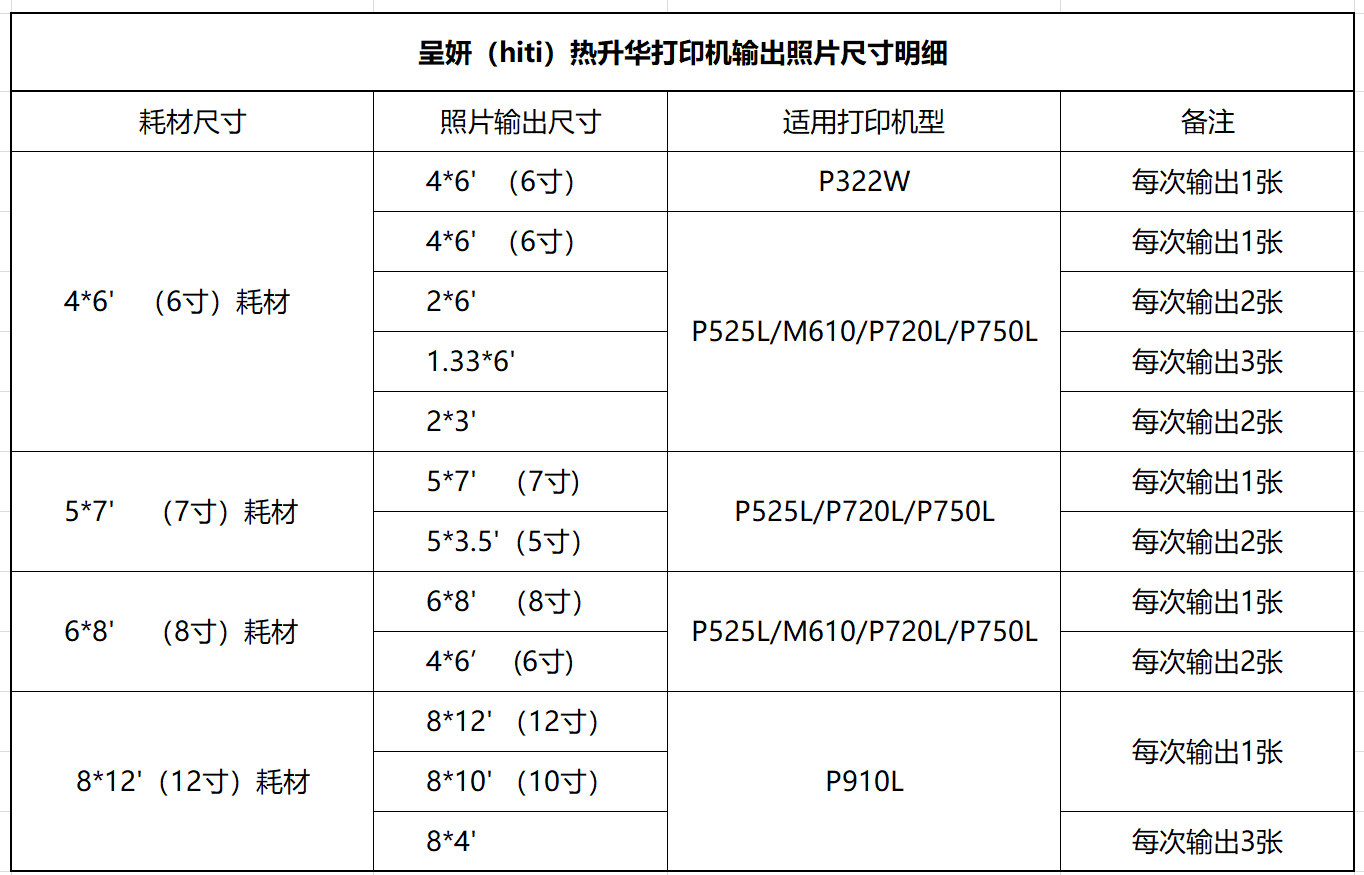 呈妍(hiti)热升华照片打印机采用了先进的热升华影像输出技术,因其出色的色彩还原性和连续性,输出的照片效果细腻、富有层次感,且极具市场价格优势,而被越来越多的商户利用其可输出的不同尺寸照片的优势开展不同种类的“快照”业务,因此汇总了呈妍(hiti)热升华打印机可输出不同尺寸照片大全和大家分享(如下表):