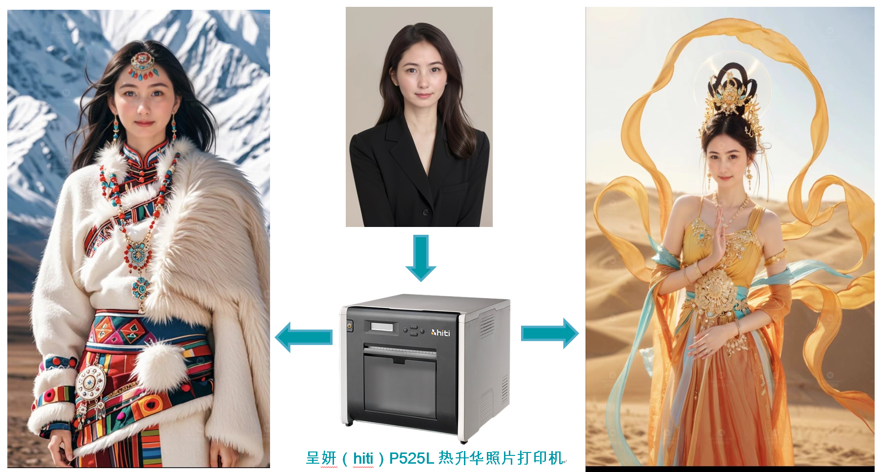 呈妍(hiti)P525L热升华照片打印机以其产品性价比最高、打印效果细腻且富有层次感、照片可长时间保存等优势成为“AI创意人物形象”照片输出业务中的必备品。