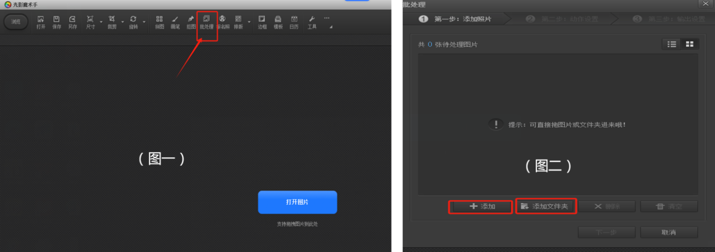 第一步:打开“光影魔术手”软件里的“批处理”功能,批量添加需要处理的照片,或添加需处理的照片文件夹