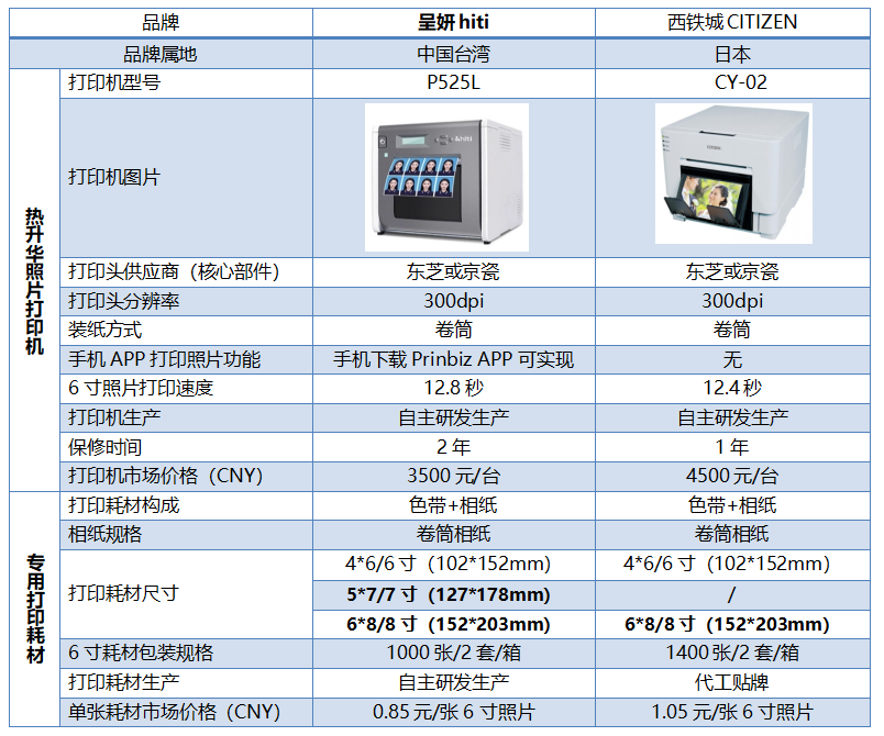作为热升华影像输出产品线中的“明珠”- 热升华打印耗材(色带+相纸)对原材料和生产工艺要求极高,为确保打印耗材市场价格始终保持最低,同时避免供货不足而耽误老板做生意, 2010年呈妍hiti在中国台湾巨资投建了全球仅两条的其中一条热升华打印耗材生产线。为便于大家加深对热升华影像输出产品的认识和了解,在此汇总了呈妍hitiP525和西铁城CY热升华照片打印机各项技术参数仅供大家参考。